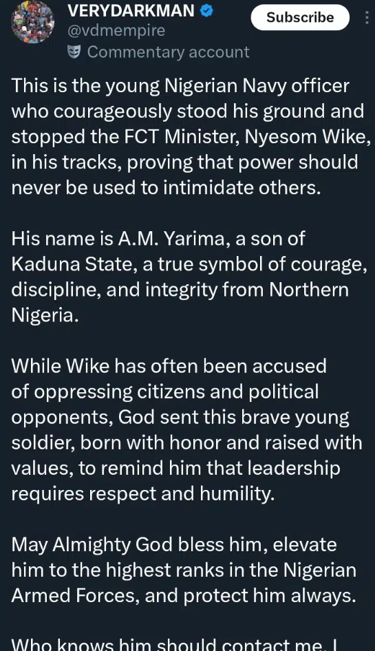 - VDM has pledged $1000 to Navy officer A.M. Yarima, who confronted FCT Minister Nyesom Wike during a viral incident in Abuja.