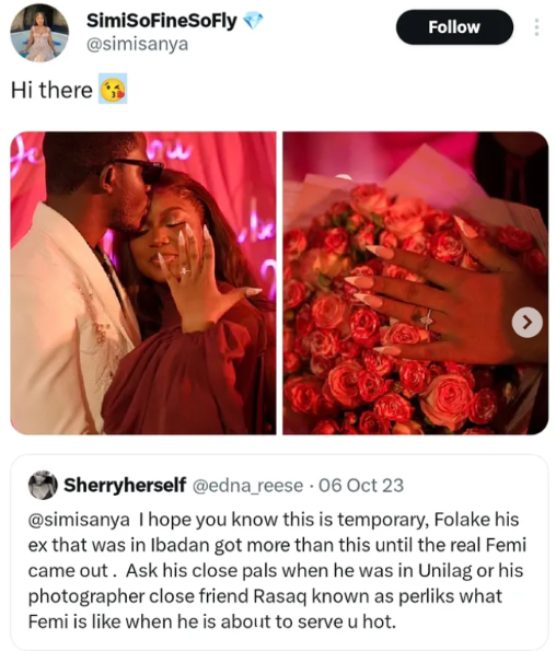 • Simi shared engagement photos, showcasing ring and bouquet, referencing a previous tweet from a woman who predicted her relationship with Femi wouldn’t last two years ago.