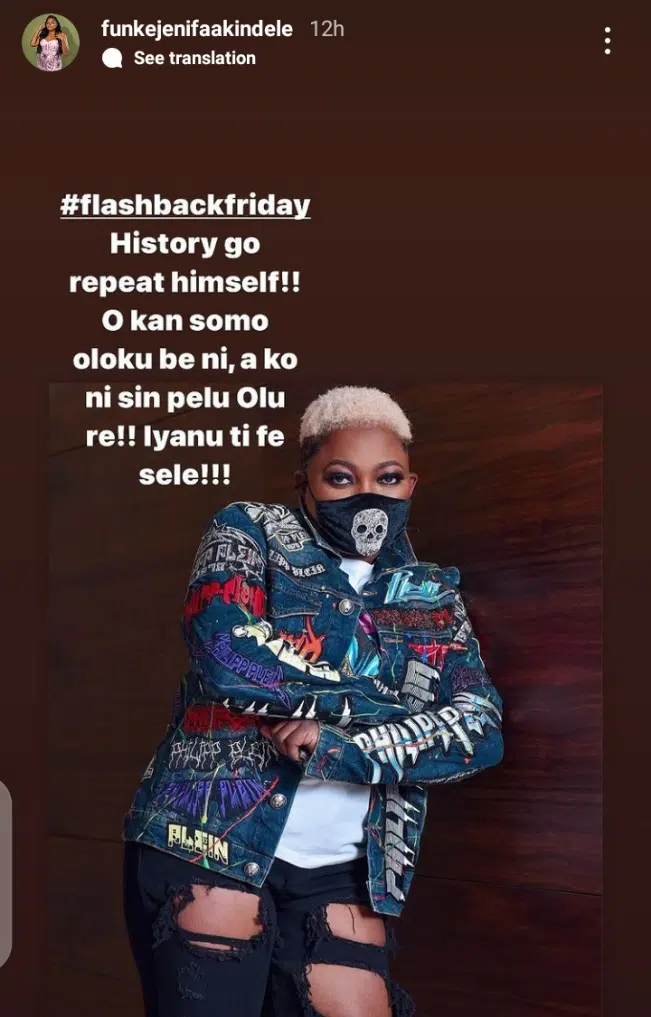 Funke Akindele took to her Instagram story to share a photo of herself wearing the famous Omo Ghetto jacket. The picture is accompanied by a caption that hints at the actress’ next move.