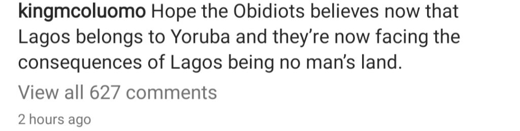 He wrote: “Hope the Obidiots believe now that Lagos belongs to Yoruba and they’re now facing the consequences of Lagos being no man’s land.”