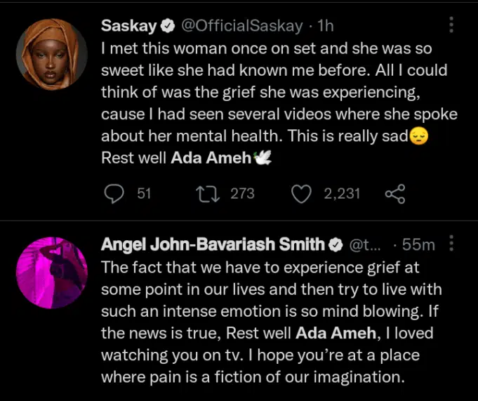 Taking to her verified Twitter handle where she reacted to the unfortunate incident, Saskay revealed that she first met Ada Ameh on a movie set and she was so nice to her as if they had met before.