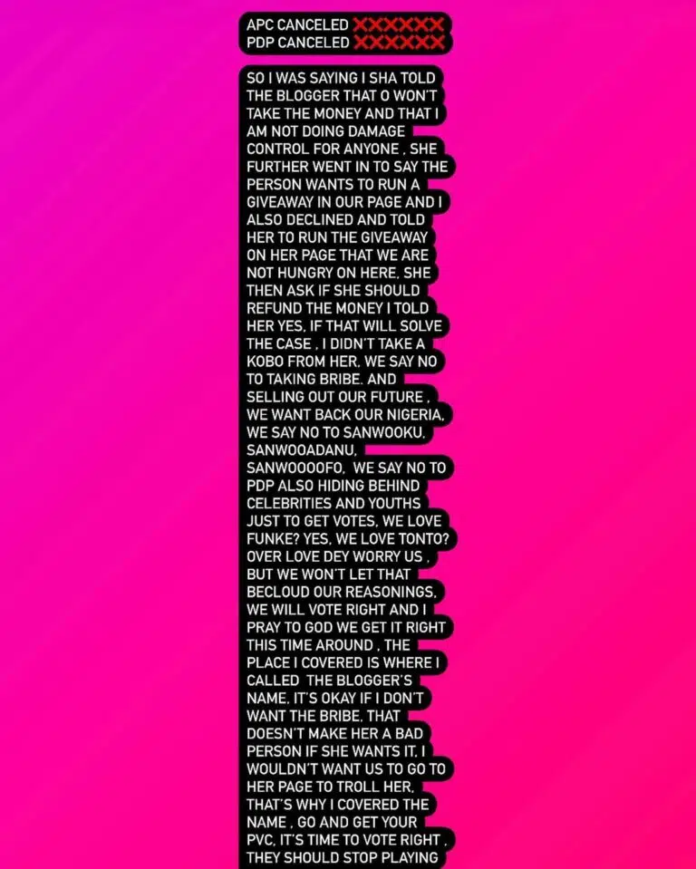 Y’all know PDP and APC don cast and the youths are ready to disgrace anybody supporting them right , so I guess PDP approached Funke to campaign for them due to the massive fans and followers/influence she has , Funke seeing how the youths are disgracing celebrities campaigning for all these old hags declined and told them that the youths will come for her, seeing that their offer campaign proposal didn’t work they decide to go further and offer her a post so it will look like she is not campaigning for them directly but also into politics , same thing trabaye abi Na Ibraye did with Our Tonto, so they make it seems like Shebi the youths wants a youth to run, here you have it oooo but lowkey Na all those old hags Dey in power, so they bring out a youth whom they know the Nigerian youths won’t be able to say NO to, they give the person a post where he or she won’t be able to work or do much, such as vice governor etc, and again PDP needed a strong opposition party for APC , because Tboy and him agbero boys sabi go to an extent to buy votes, so PDP choose Funke , We love Funke, YES, We love TONTO, Plenty Yes, but how I wish they didn’t come out under these two bas.tards Party, so as i Dey talk now, APC seeing that because of Funke PDP might have a chance ahead of them, I guess they reach out to Funke Husband to Announce the break up so it can soil Funke political chance of winning for PDP, because really the break up don happen since , even when I broke the news they kept doing damage control up and down , WHY NOW? The reason why I said this is because one blogger in my team reached out to me this morning that PDP wants me to defend Funke because they feel APC sponsored JJC, the blogger further said that they already paid her to defend Funke and they sent my own money too, I told the blogger right there , I don help you collect this kind money before , you know how many of these bas.tards ruining Nigeria I don turn down, she further said.