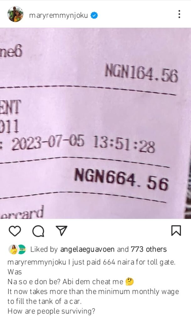 Mary Njoku shared her receipt on her Instagram page, revealing that she had paid 664 naira for the toll gate.
