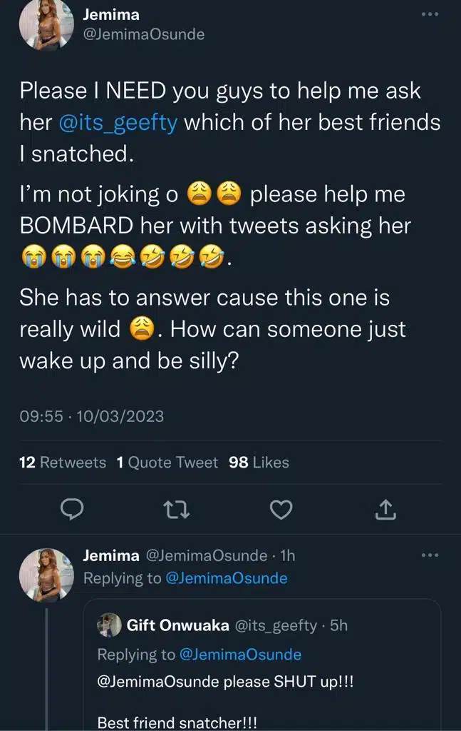 Jemima was on Twitter, minding the business that pays her when a user from nowhere responded to one of her tweets and called her a “best friend snatcher”.