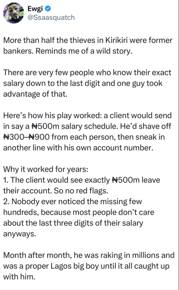 According to a viral narration, the banker devised a scheme that relied on the fact that most employees rarely pay attention to the exact last digits of their salaries. When a client would send a salary schedule of, say, ₦500 million for disbursement, the banker would discreetly shave off between ₦300 and ₦900 from each employee’s pay. He would then insert an additional line with his own account number, pocketing the accumulated funds.
