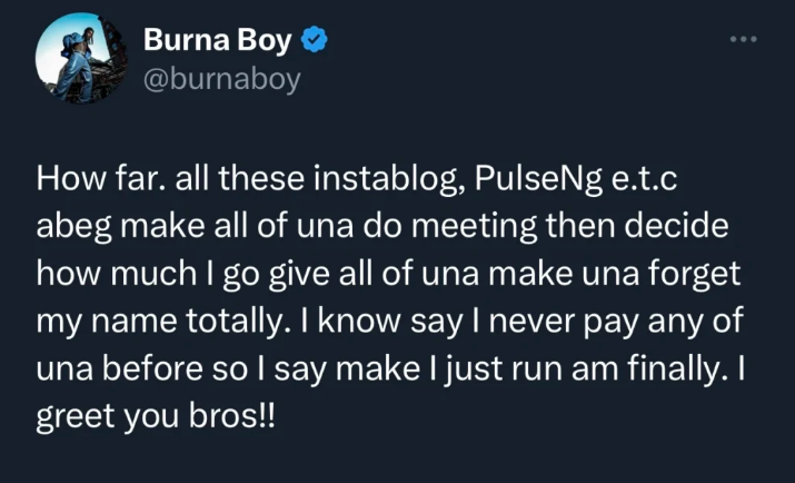 “How far. all these instablog, PulseNg e.t.c abeg make all of una do meeting then decide how much I go give all of una make una forget my name totally. I know say I never pay any of una before so I say make I just run am finally. I greet you bros!!”