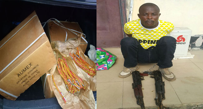 Two AK47 rifles hidden in a “Ghana-Must-Go” bag were found with the suspect. He led the IRT operatives to a vehicle parked discreetly within Ikorodu, where a large catche of dynamite and detonators was recovered— from its boot.