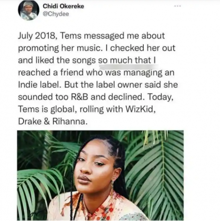 PR expert Chide has shared screenshots of how Tems was rejected by a record label in 2018 but today is making it huge and rolling with Wizkid, Drake & Rihanna.