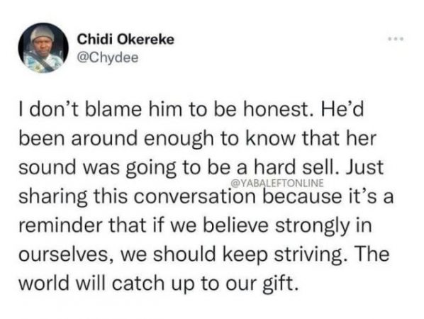 Adding that he’s sharing this as a reminder that if we believe strongly in ourselves, we should keep striving and the world will catch up with our gift just as it happened for Tems who is now going international.