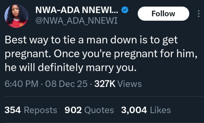 A lady has stirred heavy reactions on social media after declaring that the best way to tie a man down is to become pregnant for him. Her statement, posted on X (formerly Twitter), immediately sparked a heated debate online.