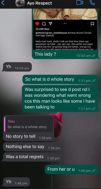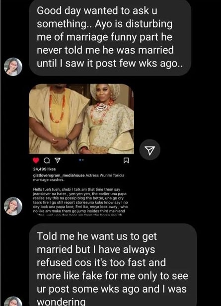The blogger claimed that a lady had reached out to her when she broke the news of the couple’s crashed marriage. The lady claimed that she was dating Wumi’s husband and he had denied being married.