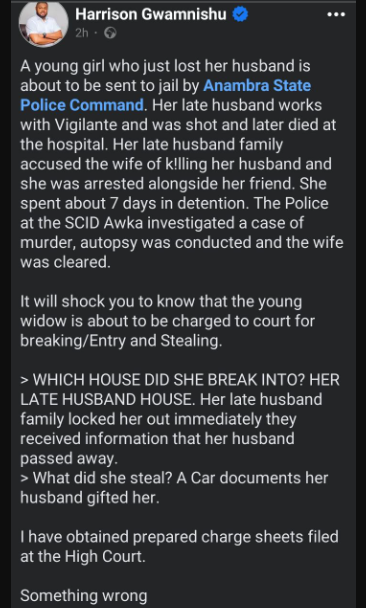 - Harrison Gwamnishu’s Facebook post revealed that the young widow’s husband, a vigilante, was shot and later died in the hospital.