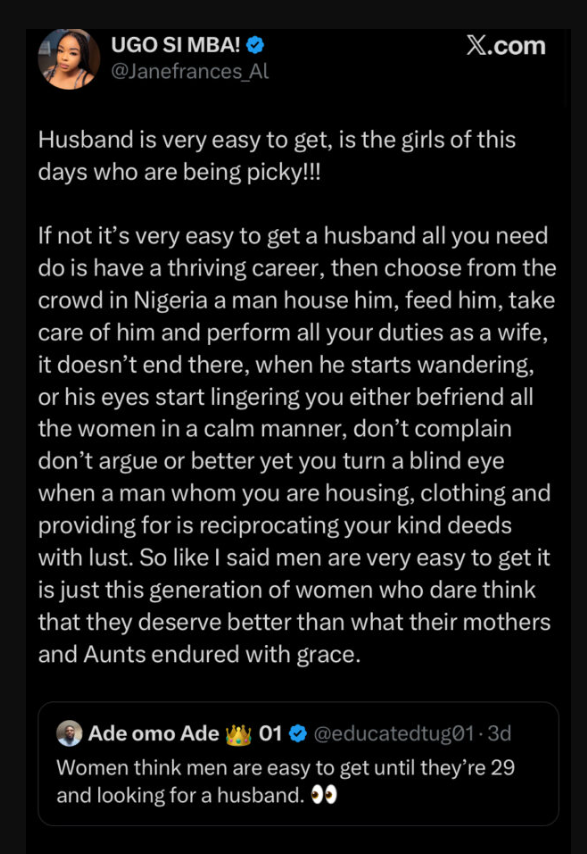 In a viral post shared on X by @Janefrances_Al, she claimed that “husband is very easy to get,” arguing that men are readily available but women make things difficult by being too selective.
