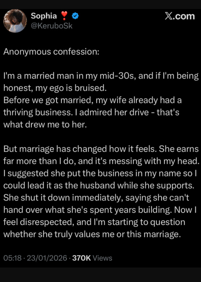 - A married man has ignited widespread debate on social media after publicly expressing frustration over his wife’s refusal to hand over control of her successful business to him.