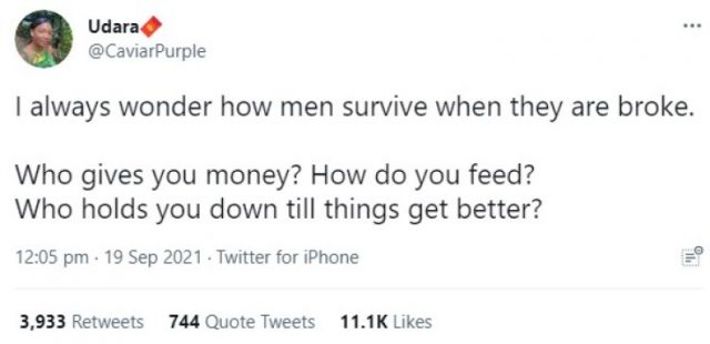 The young woman wondered how men get money for food whenever things are terribly bad as she never experienced some of the struggles they complain about no matter how broke she was.