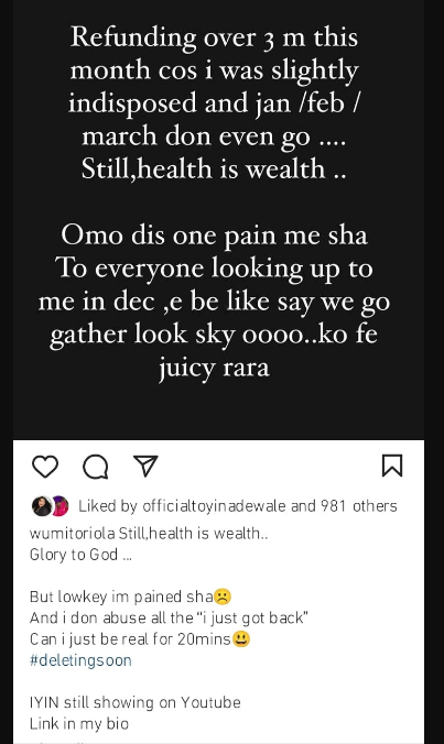 In a since-deleted Instagram post, she claimed she was ill this month and had to return N3 million.