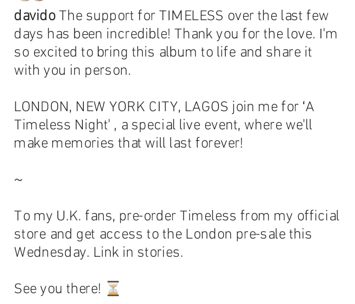 LONDON, NEW YORK CITY, LAGOS join me for ‘A Timeless Night’, a special live event, where we’ll make memories that will last forever…..”.