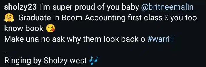 He captioned the video,”I am super proud of you, baby @britneemalin. Graduate in Bcom Accounting, first class. You too sabi book! Make una no ask why Dem dey look back o”.