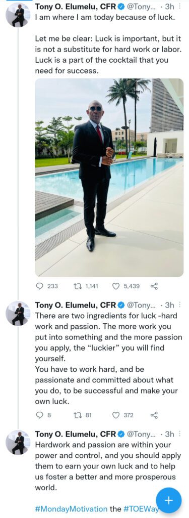 He wrote: “I am where I am today because of luck. Let me be clear: Luck is important, but it is not a substitute for hard work or labour. Luck is a part of the cocktail that you need for success”