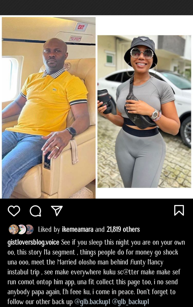 “See if you sleep this night you are on your own oo, this story Na segment , things people do for money go shock una ooo, meet the Married olosho man behind Aunty Nancy instabul trip , see make everywhere kuku sc@tter make make sef run comot ontop him app, una fit collect this page too, i no send anybody papa again, Eh feee ku, i come in peace. Don’t forget to follow our other back up @glb.backup1 @glb_backup1”