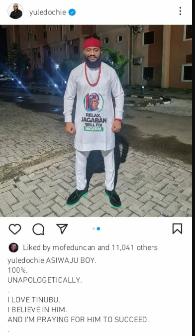 The fair-skinned actor posted a photo of himself wearing an attire modeled after Tinubu on his Instagram page. The President’s face was printed on an indigenous top that the actor was sporting.