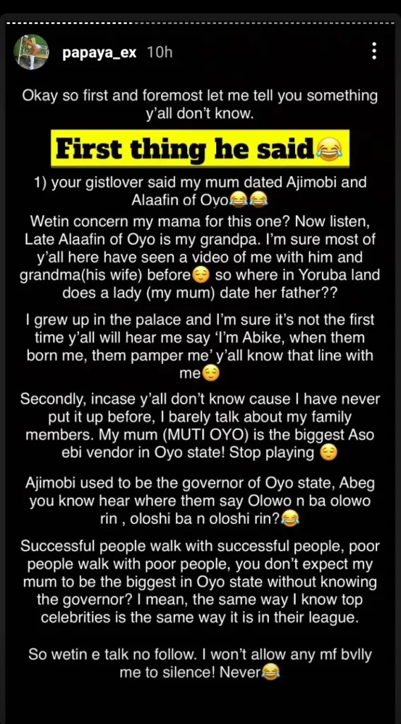 GISTLOVER had also laid bare that Papaya Ex’s mum, Muti Oyo, used to be the side chick of Ajimobi as well as the Alaafin of Oyo.