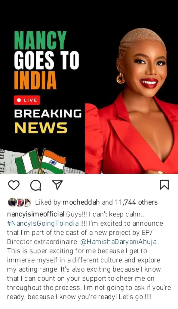“Guys!!!! I can’t keep calm…#NancyIsGoingIndia!! I’m excited to announce that I’m part of the cast of a new project by EP/Director extraordinaire @HamishaDaryaniAhuja. This is super exciting for me because I get to immerse myself in a different cultist and explore my acting range. It’s also exciting because I know that I can count on your support to cheer me on throughout the process. I’m not going to ask if you’re ready, because I know you’re ready! Let’s go!!!”.