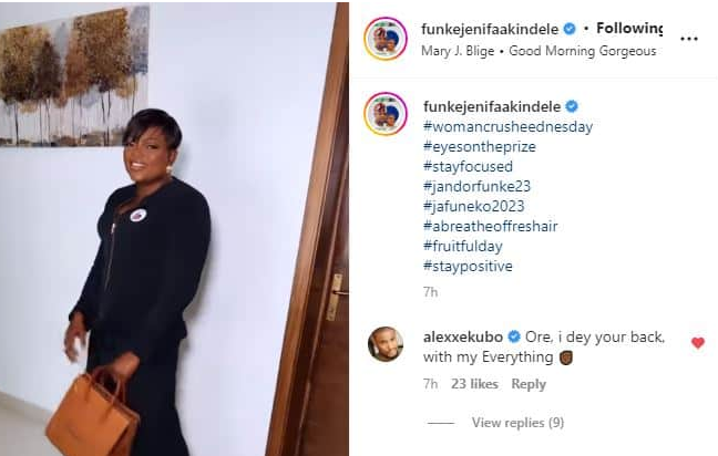 The actress turned politician, Funke Akindele shared a post online where she captioned herself in a beautiful outfit. Among the many reactions trailing the post, Alex Ekubo declared love for her.