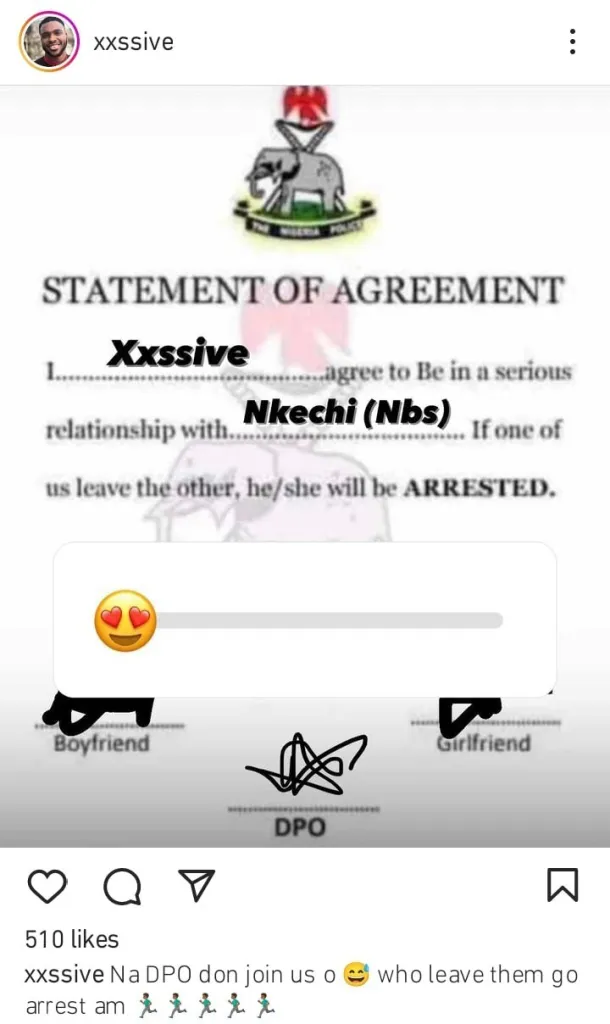 According to the declaration, the couple made the decision to criminalize anyone who ruined their marriage.”Na DPO don join us o,” commented on the agreement declaration that Nkechi’s guy had put on his Instagram page. ” Who am I to leave them in arrest?