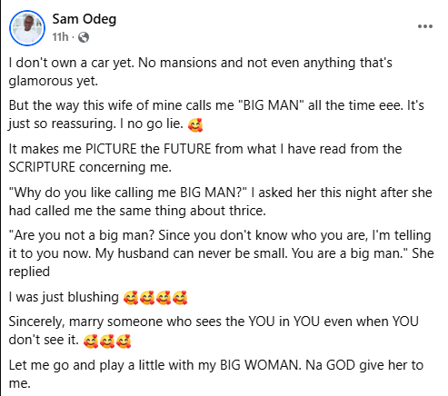 A Nigerian man praises his wife for always calling him a ‘Big Man’ in a stylish way, even though he doesn’t own a car or a house yet.