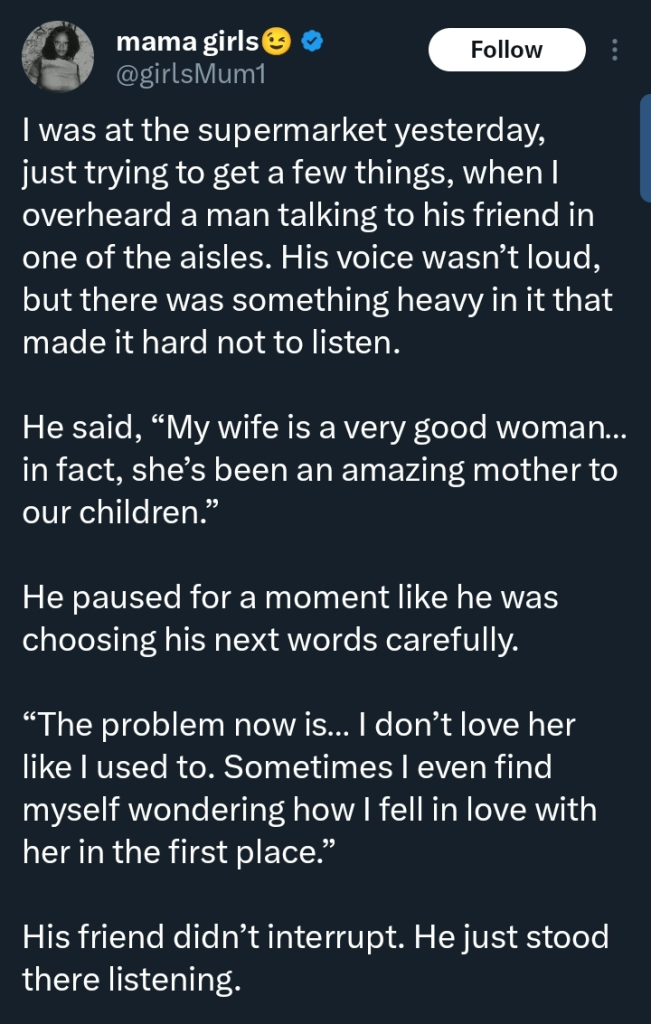 She recounted on X (formerly Twitter) overhearing a private conversation between two men that left her reflecting on the complexities of love and marriage.