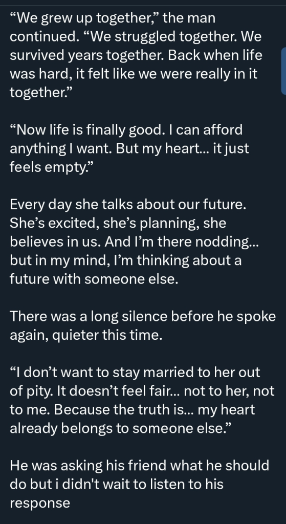 “Every day she talks about our future. She’s hopeful, excited, making plans, believing in us. And I nod along… but in my mind, I’m imagining a life with someone else,” he revealed.