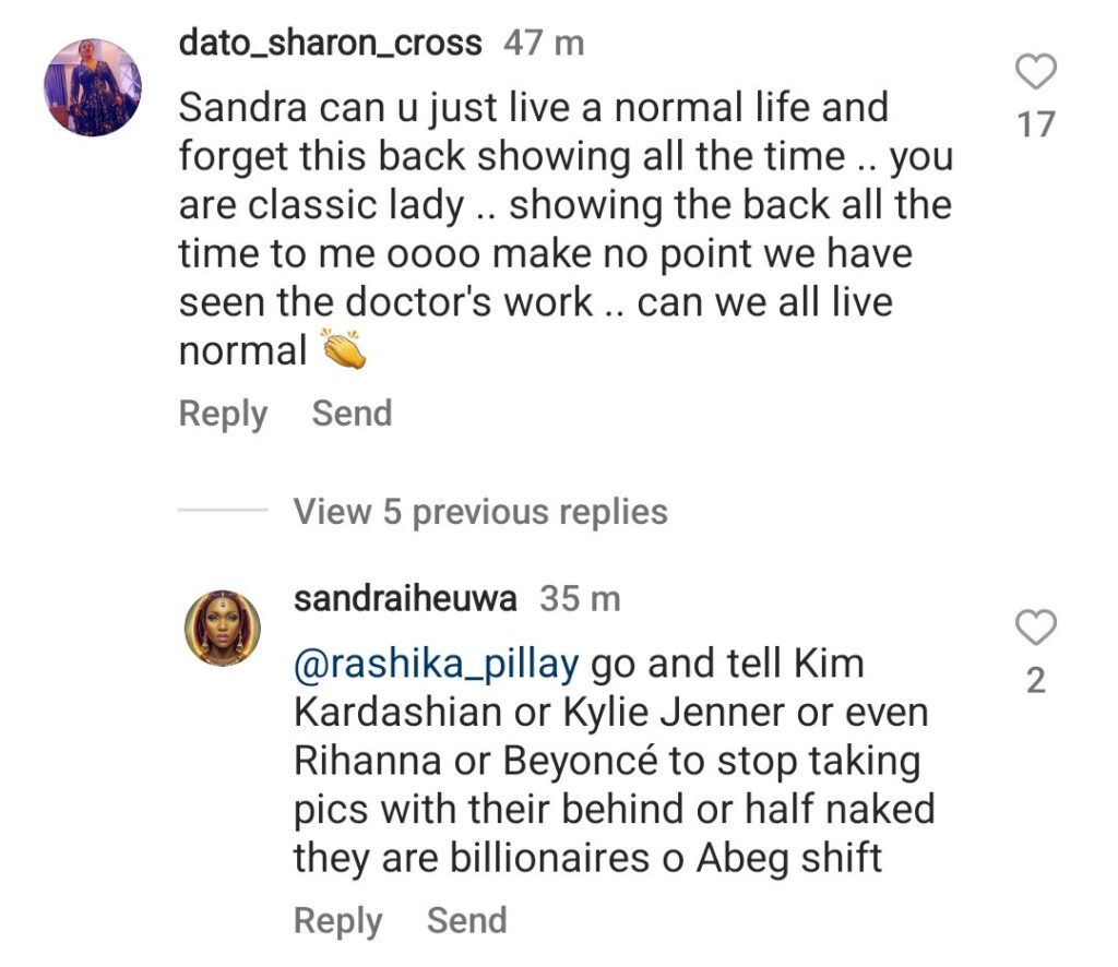 They told her they know she got her body done after childbirth but added that that’s no reason to keep flaunting her doctor’s work all the time.