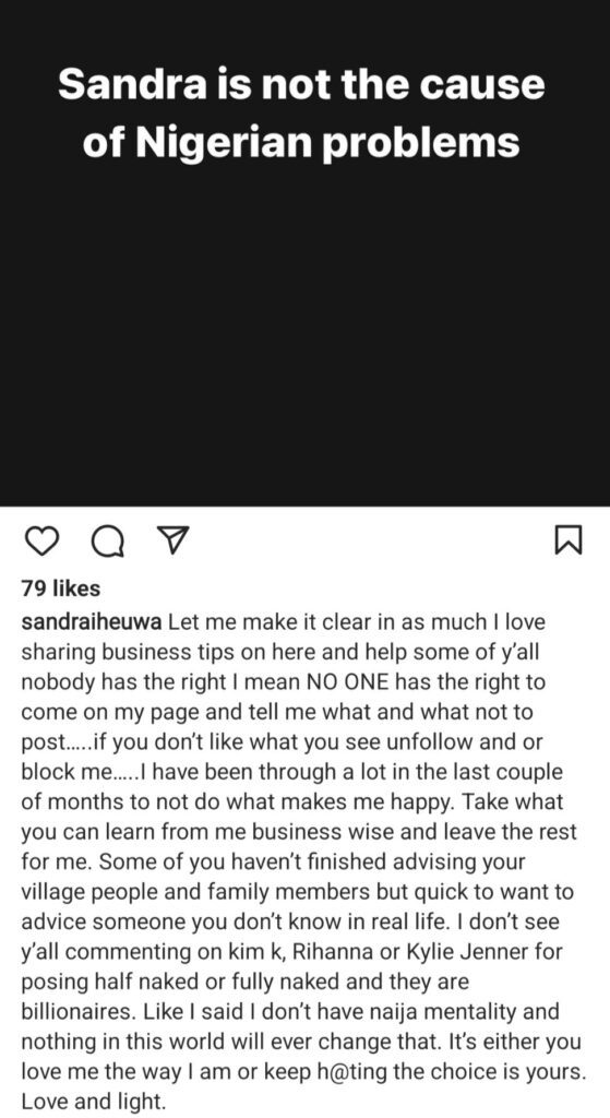 Nigerina businesswoman cum Ubi Franklin’s babymama, Sandra Iheuwa has warned her followers who took it upon themselves to advise her.