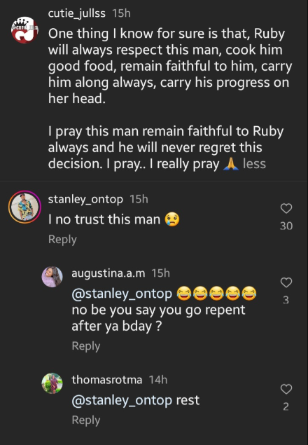 “I pray this man remain faithful to Ruby always and he will never regret this decision. I pray.. I really pray”