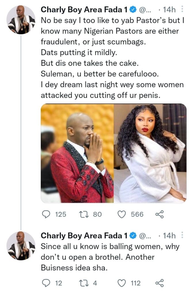 As such, he warned the controversial clergyman to be careful of the women around him. Charly Boy claimed to have had a bad dream about him where some women were trying to cut off his penis.