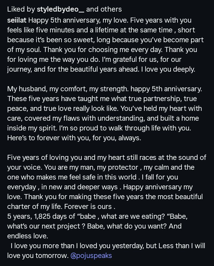 Nollywood actress Adeyemo Adebola, widely known as Seiilat, has celebrated five years of marriage with her husband, Peju Adeyemo, marking the occasion with a heartfelt tribute filled with love and appreciation.
