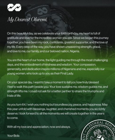 President Bola Ahmed Tinubu sent a sweet message to his wife, Remi, on her birthday.