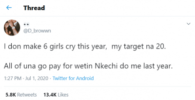 “I don make 6 girls cry this year, my target na 20. All of una go pay for wetin Nkechi do me last year.”