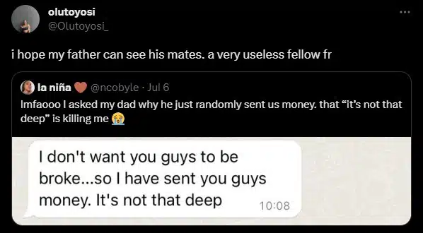 Sharing the snapshot from her father, the lady wrote, “lmfaooo I asked my dad why he just randomly sent us money. that “it’s not that deep” is killing me 😭.”
