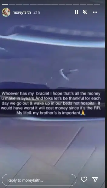 Faith Morey who recently confirmed split from her American husband, Randy Morey, after being allegedly involved with Davido’s father, took to Instastories to disclose that her $15,000 Bracelet was snatched away from her at a friend’s surprise party.