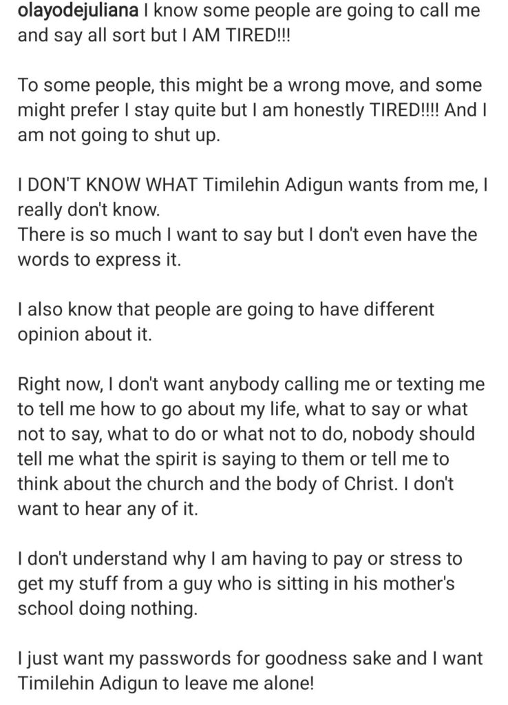 “I Just Want My Passwords, Stop Impersonating Me!” – Juliana Oloyede ‘Toyo Baby’ Calls Out Pastor Timilehin Adigun