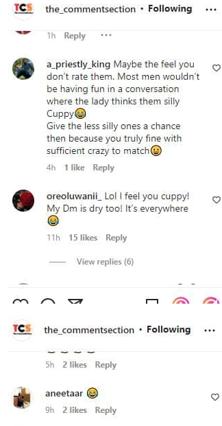 One Gerald wrote, “Maybe the feel you don’t rate them. Most men wouldn’t be having fun in a conversation where the lady thinks them silly, Cuppy😂