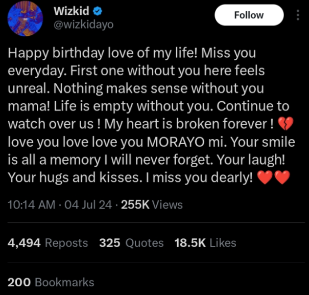Wizkid, the acclaimed Nigerian musician, went to his X page to pay a touching homage to his late mother, Mrs. Morayo, on her posthumous birthday.
