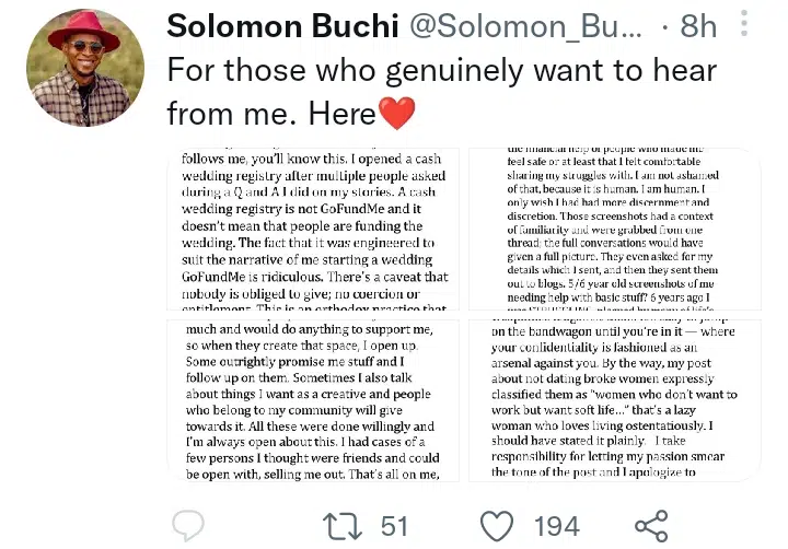 “I never opened a GoFundMe account for my wedding” – Solomon Buchi says days after multiple women exposed chats of him ‘begging’ for money