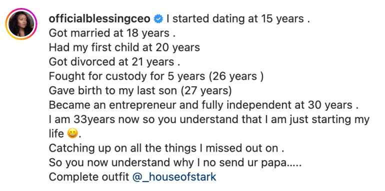 Self-acclaimed relationship expert, Blessing Okoro has shared a personal story about her life.