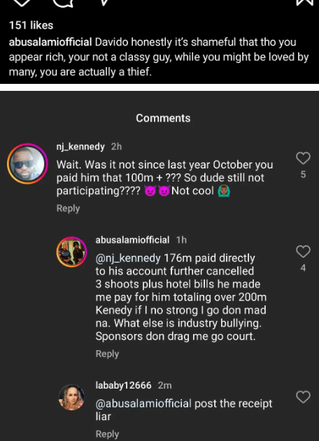 On his Instagram page, @abusalamiofficial wrote: “Davido, honestly, it’s shameful that, though you appear rich, you’re not a classy guy. While you might be loved by many, you are actually a thief.”