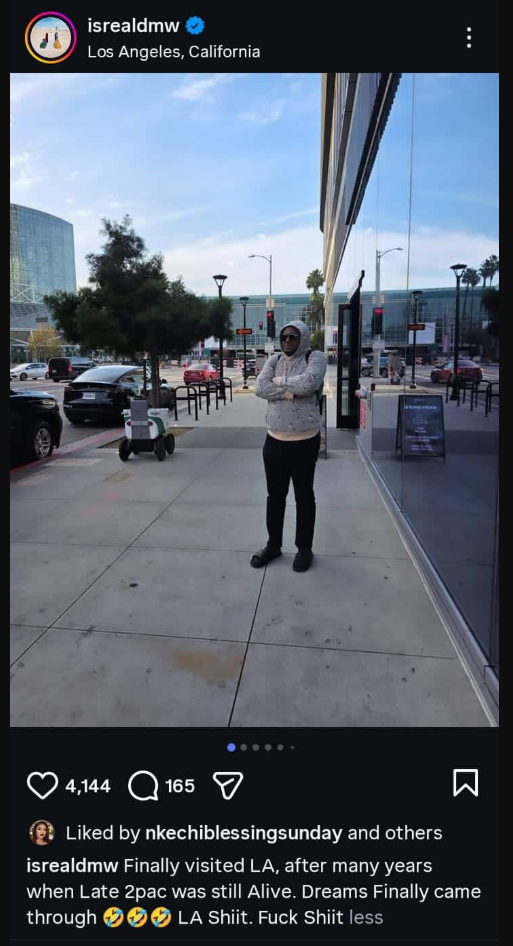 “Finally visited LA, after many years, when Late 2pac was still Alive. Dreams finally came through LA Shiit. Fuck Shiit,” he wrote.