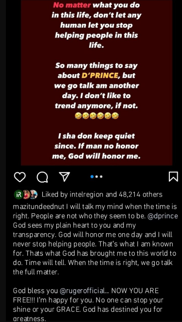 “I will talk my mind when the time is right. People are not who they seem to be. @dprince God sees my plain heart to you and my transparency. God will honor me one day and I will never stop helping people. That’s what I am known for. That’s what God has brought me to this world to do. Time will tell. When the time is right, we go talk the full matter.