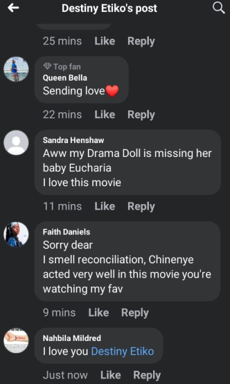 However, Destiny during her Facebook live with fans, on Friday, is seen watching one of her movies ‘Crazy Neighbors’ Chinenye featured on before their fall-out.
